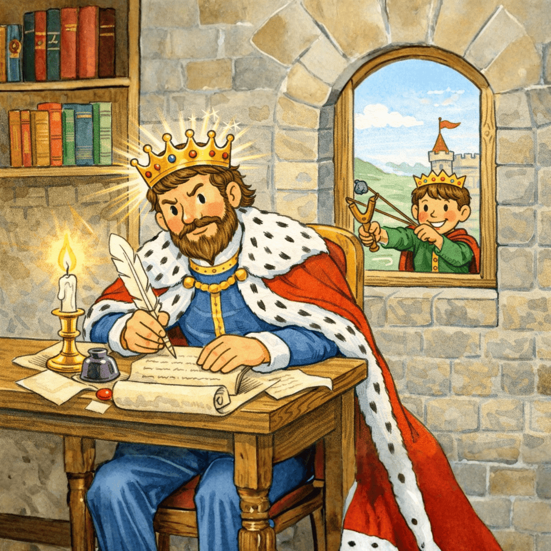 Prince Mischievous is meant to be a scholar but is always into mischief, trying to distract his father from his writing, with a slingshot.